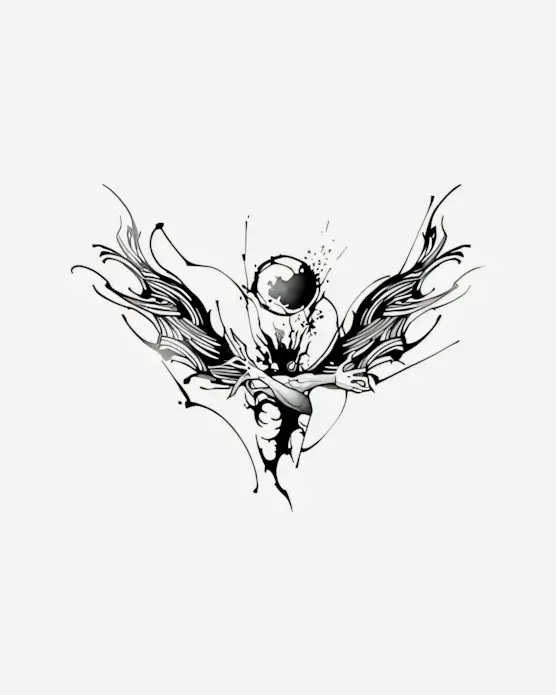 An abstract figure with wing-like forms and splatters of ink, suggesting a dynamic and perhaps turbulent ascent into an unknown realm.