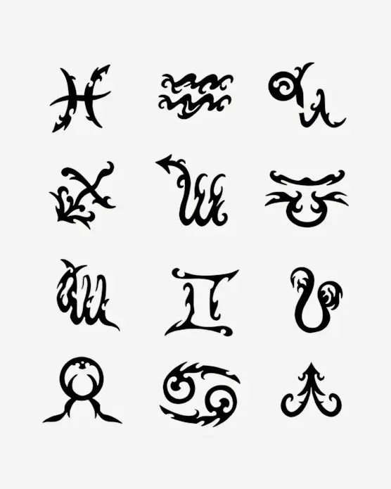 Minimalist and abstract glyphs representing the zodiac signs, using simplified yet evocative forms.