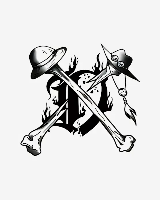 Two hats atop crossed bones, emblazoned with a stylized “D,” evoking a sense of adventure, legacy, and perhaps a fateful crossroads.