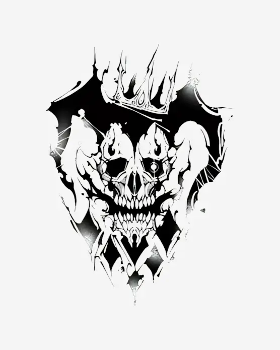 A skull wreathed in chaotic darkness and crowned with sharp, abstract forms, representing a formidable and destructive force.