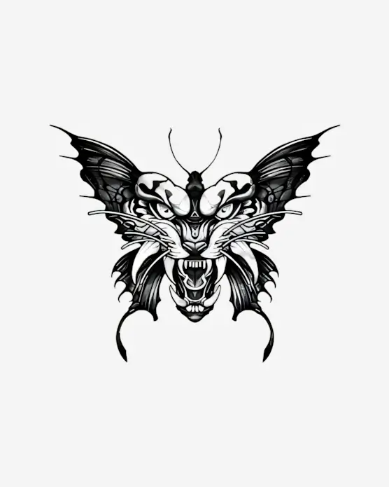 A striking image of a feline head adorned with butterfly wings, a surreal fusion of earthly ferocity and ethereal grace.