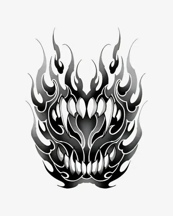 A depiction of fierce teeth surrounded by stylized flames, evoking raw power, untamed aggression, and the consuming nature of wrath.