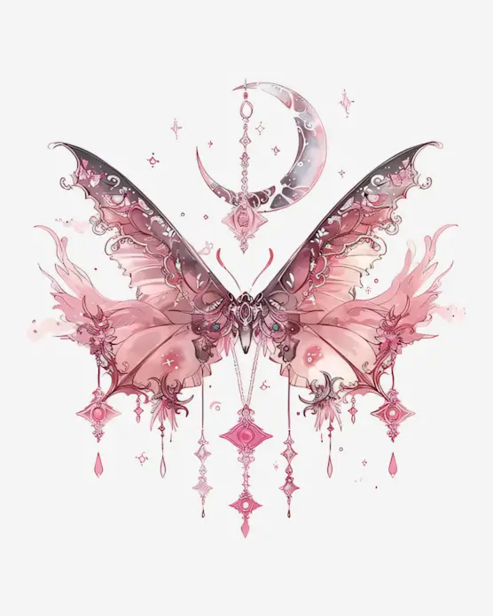 Intricate, ornate pink and grey moth wings are adorned with a crescent moon and dangling jewels, suggesting a creature of nocturnal beauty and mystical charm.