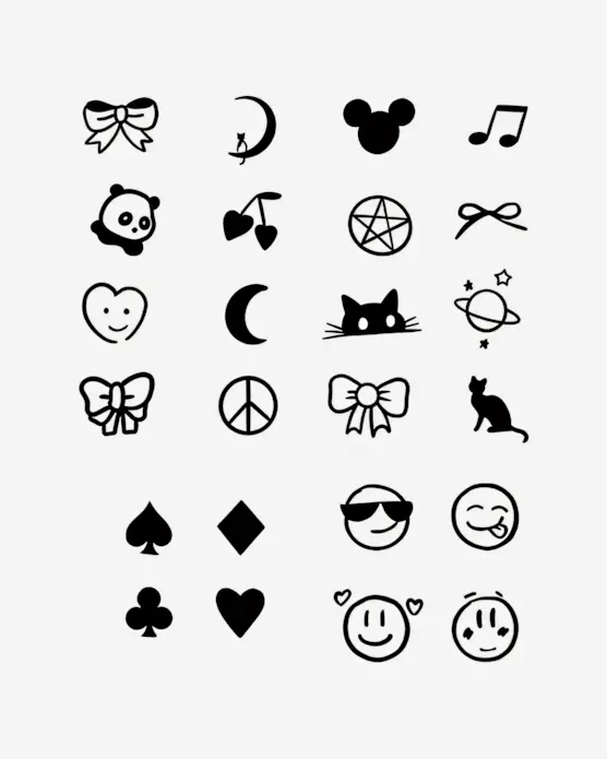 A playful assortment of minimalist icons, from bows and cats to musical notes and zodiac symbols, each carrying a touch of lighthearted charm.