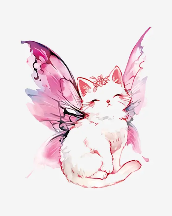 A peaceful white kitten with delicate pink butterfly wings rests serenely, a small flower adorning its head, radiating tranquility and gentle magic.